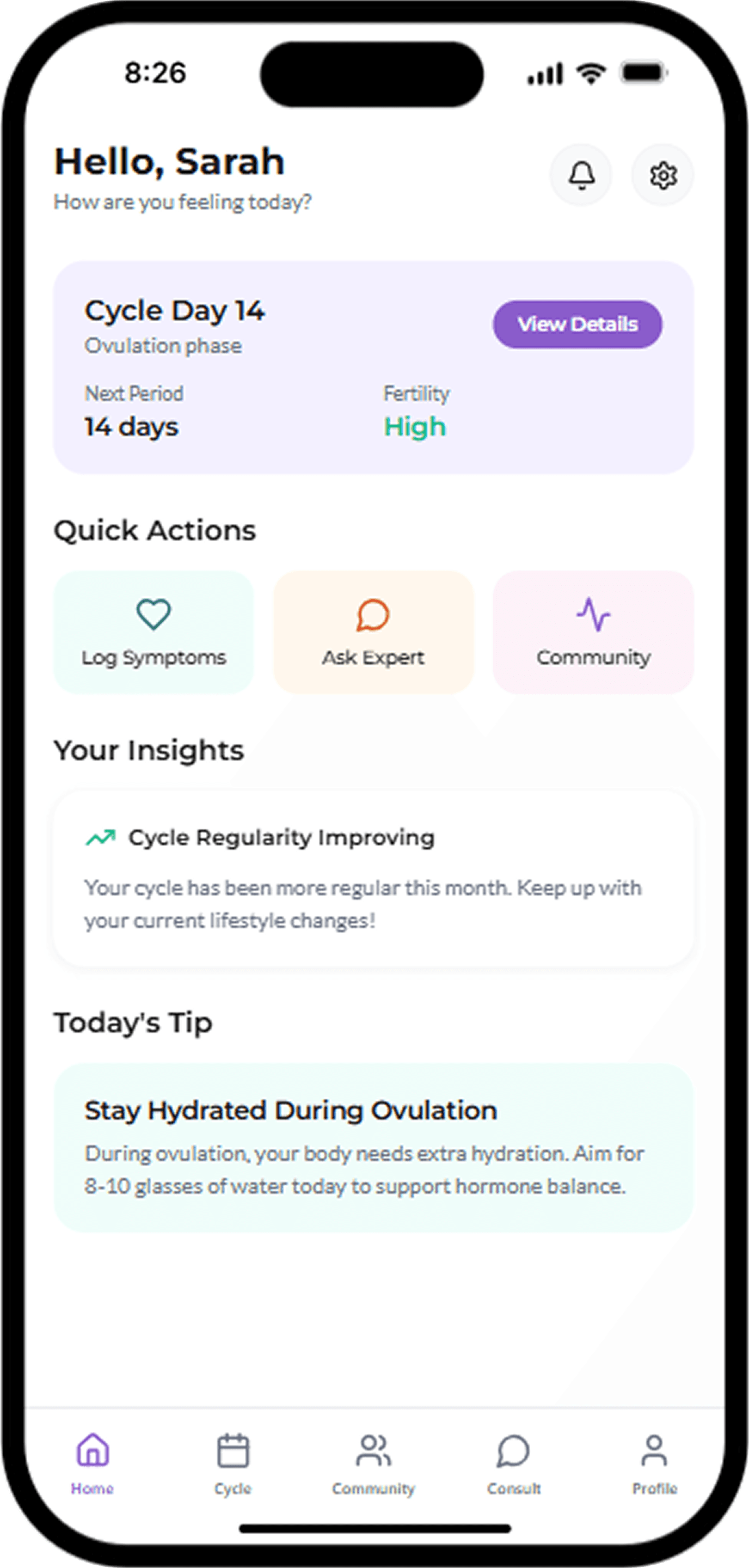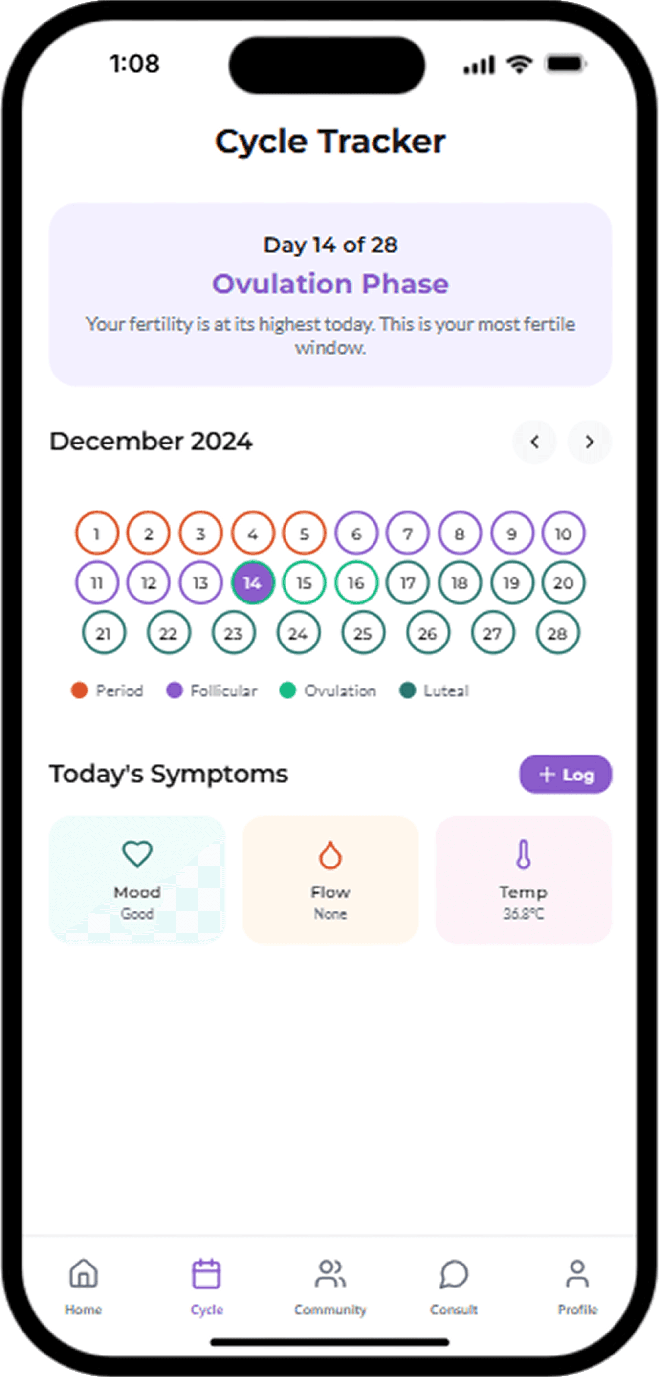 My FemFlo is a mobile platform that helps women track their cycles, manage PCOS symptoms, access health tips, and connect with medical experts, all privately and conveniently.