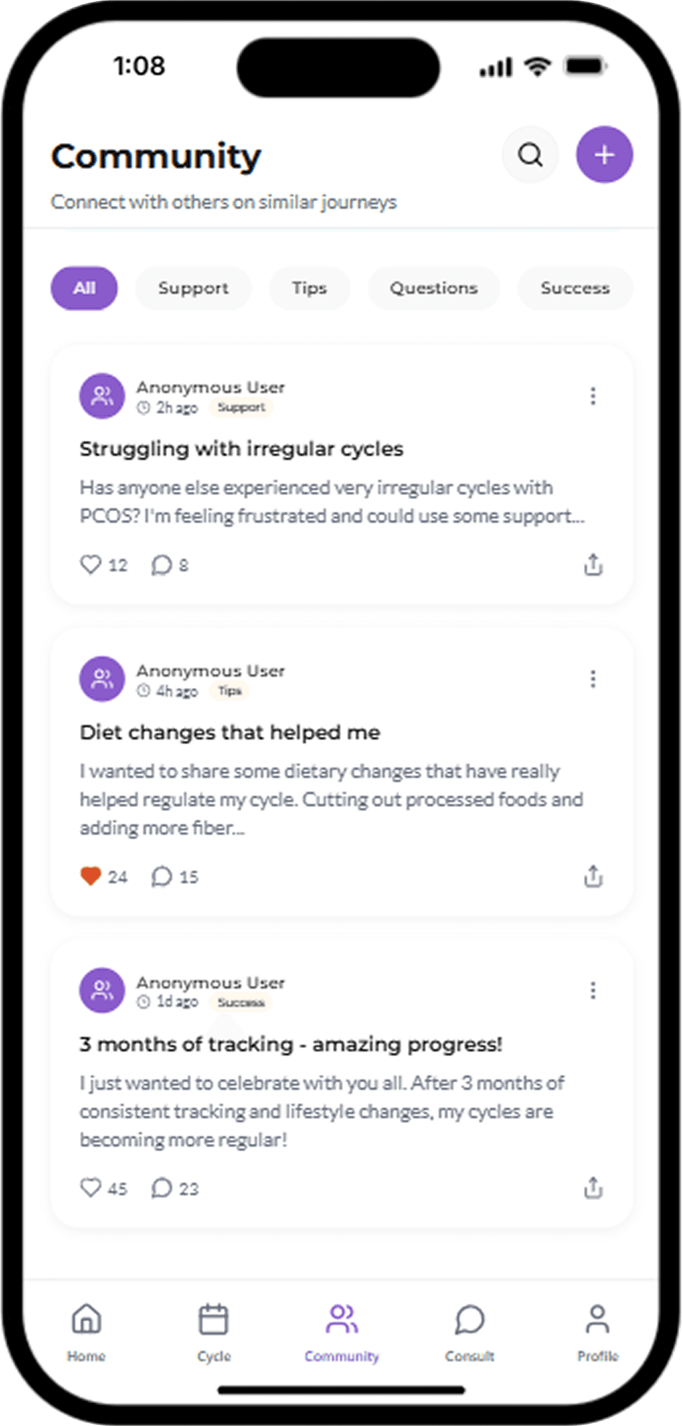 Join a safe, anonymous community to share and connect with others living with PCOS