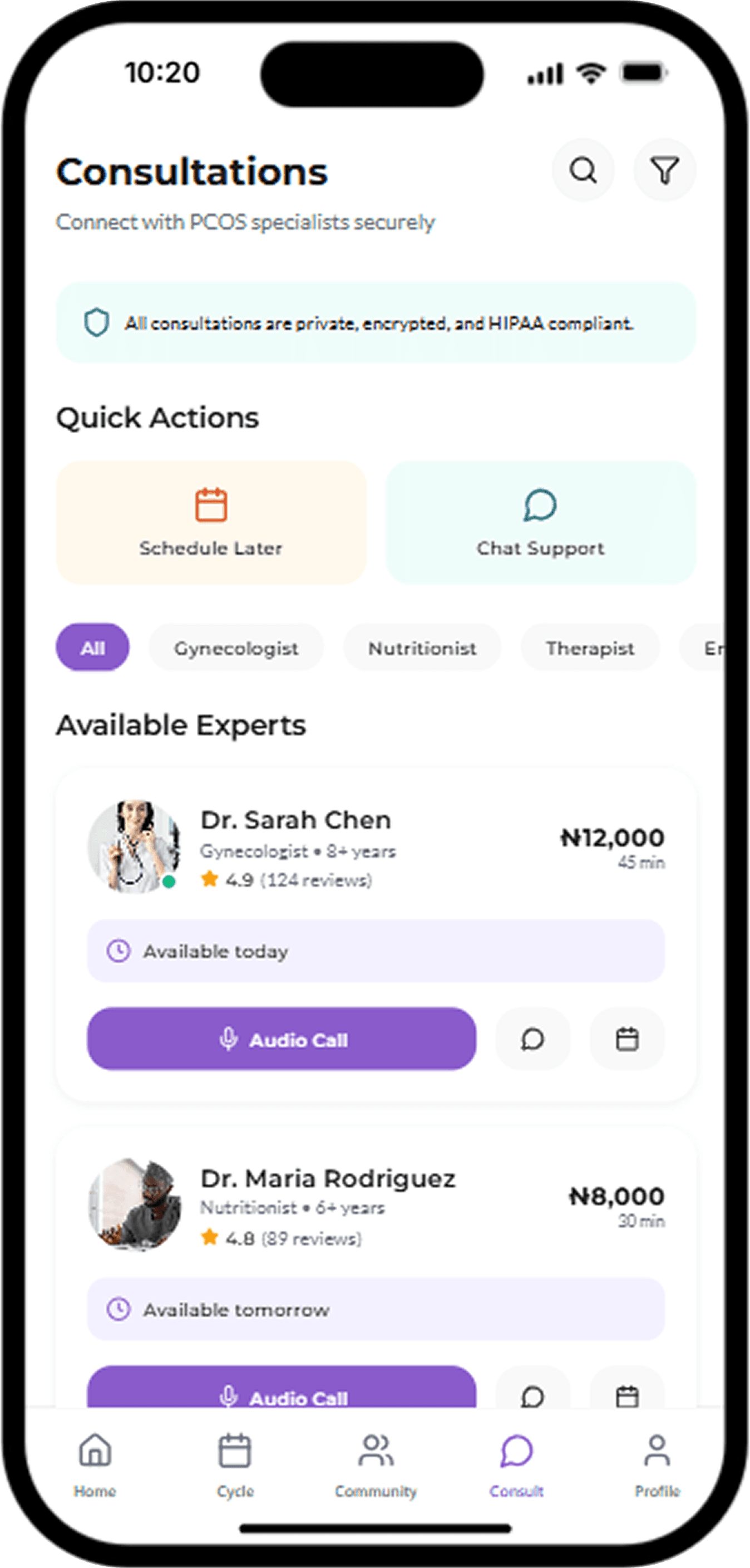 Privately consult trusted doctors through a secure platform for personalized PCOS guidance